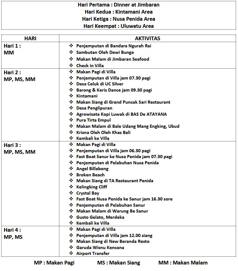 *harga termasuk tour 4 hari dan Villa 3 malam opsi A*